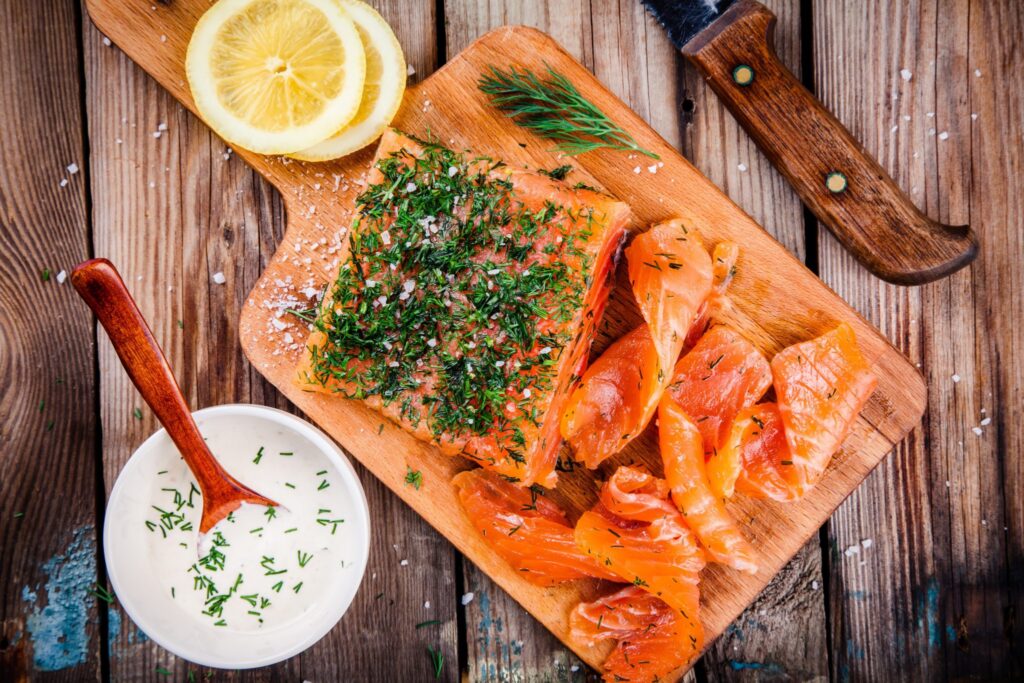 - Saler et sucrer les filets de saumon. Réserver dans une boite hermétique et laisser mariner 12h.